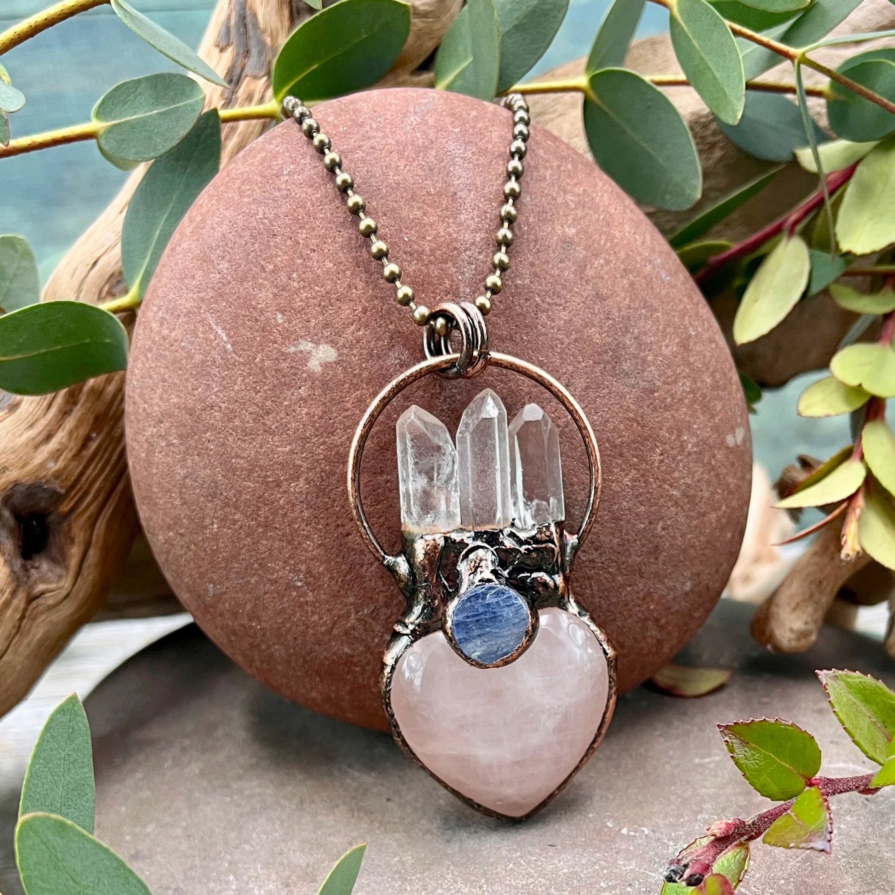 Open your heart to harmony with this Rose Quartz Heart Necklace. Paired with a trio of Quartz points, and accented with a circle of Kyanite, this beautiful bronze necklace is a trendy addition to your wardrobe.